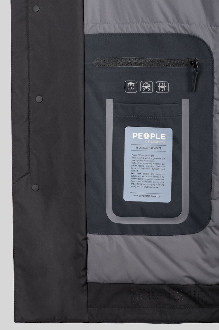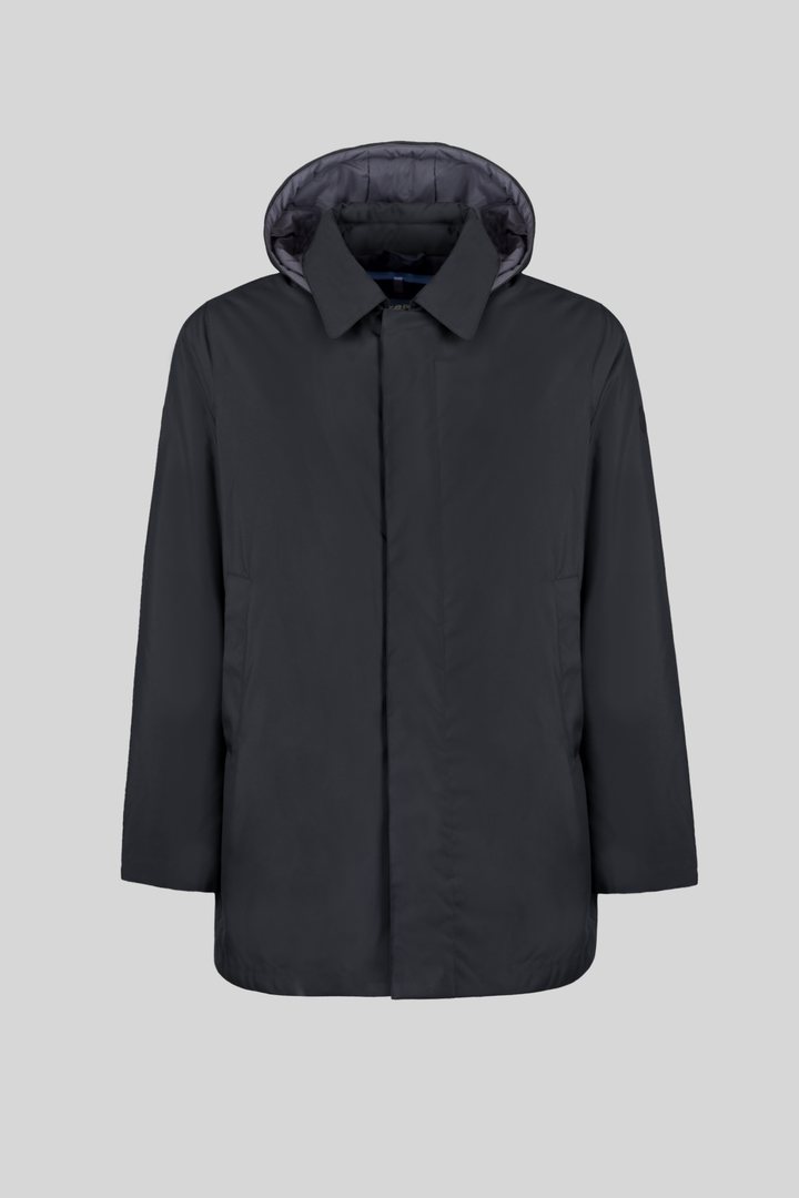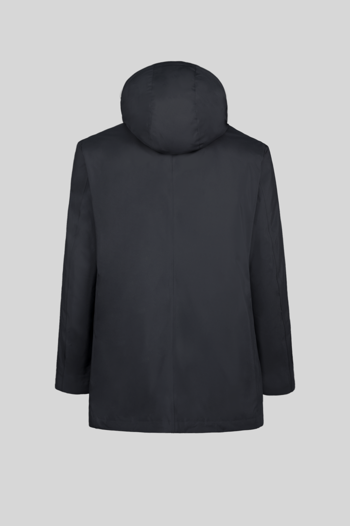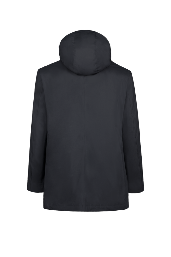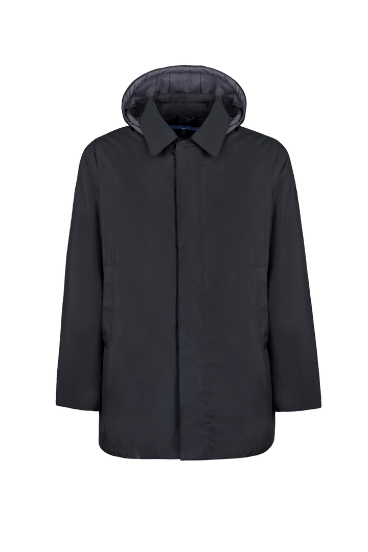 - Trench corto in tessuto tecnico con collo camicia e cappuccio staccabile con zip e coulisse, interno trapuntato in isolante termico “FELLEX” 100% riciclato.