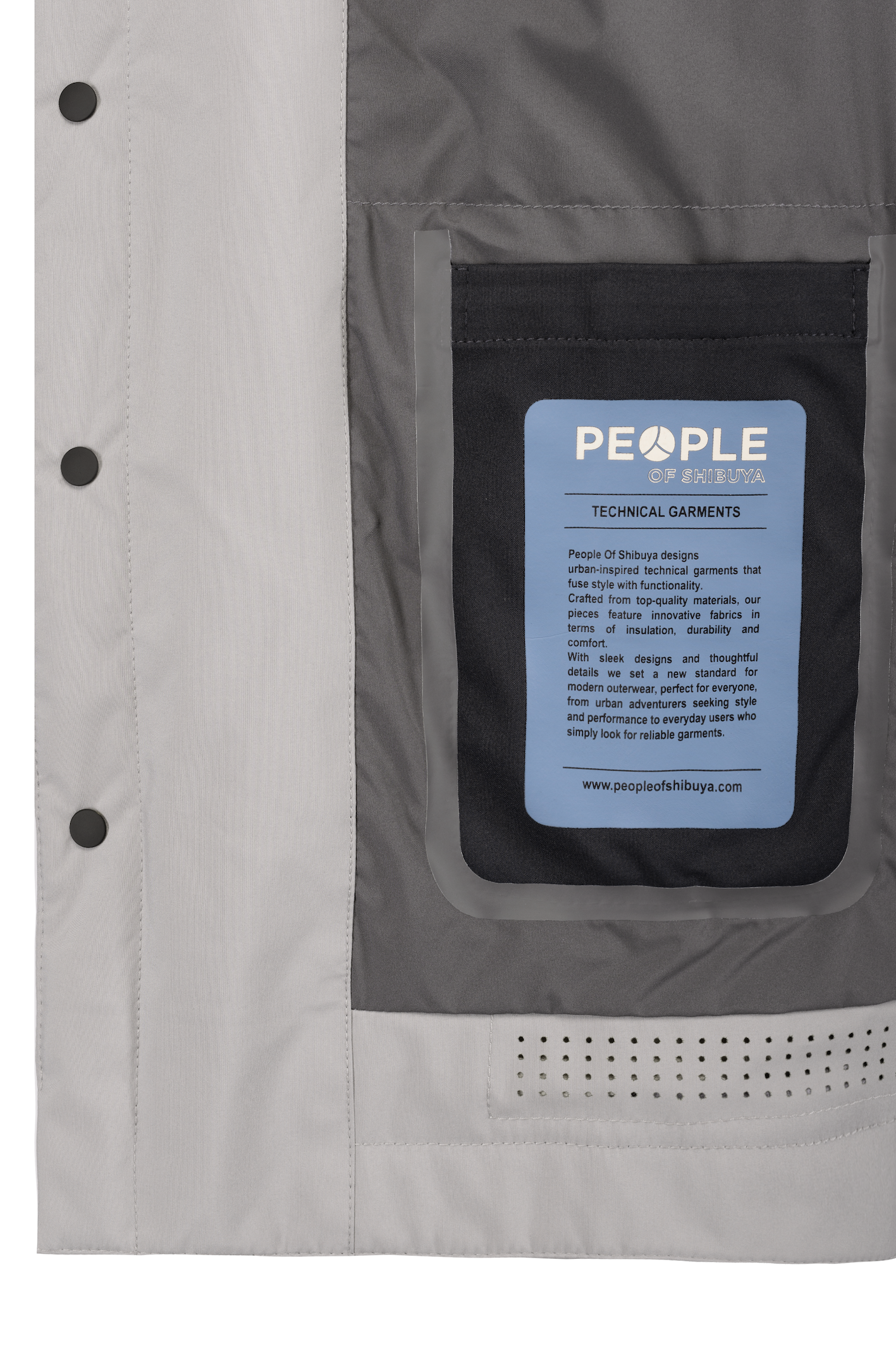 - Chiusura con bottoni a pressione nascosti.
