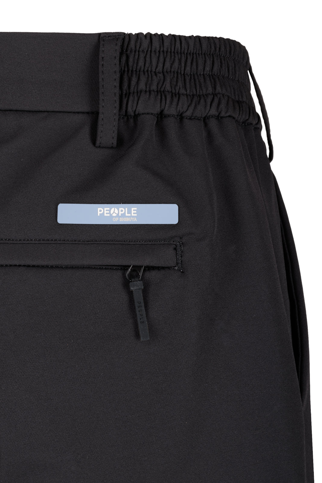 - Cintura in vita con fianchi elasticizzati e passanti e bottone a gancio personalizzato.