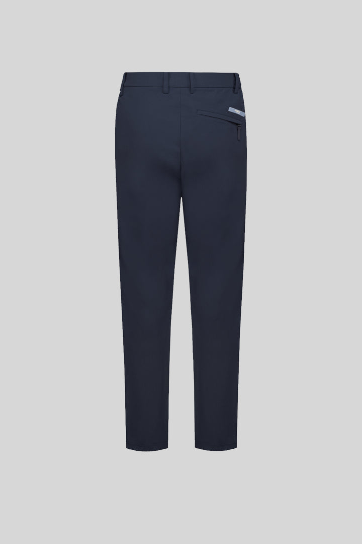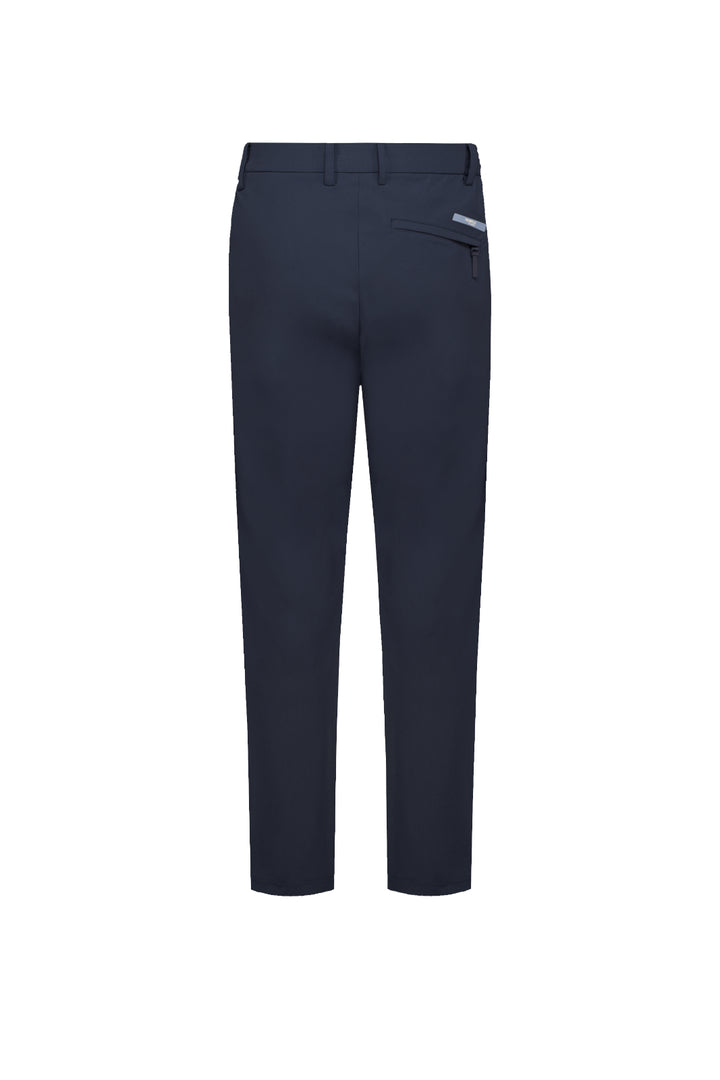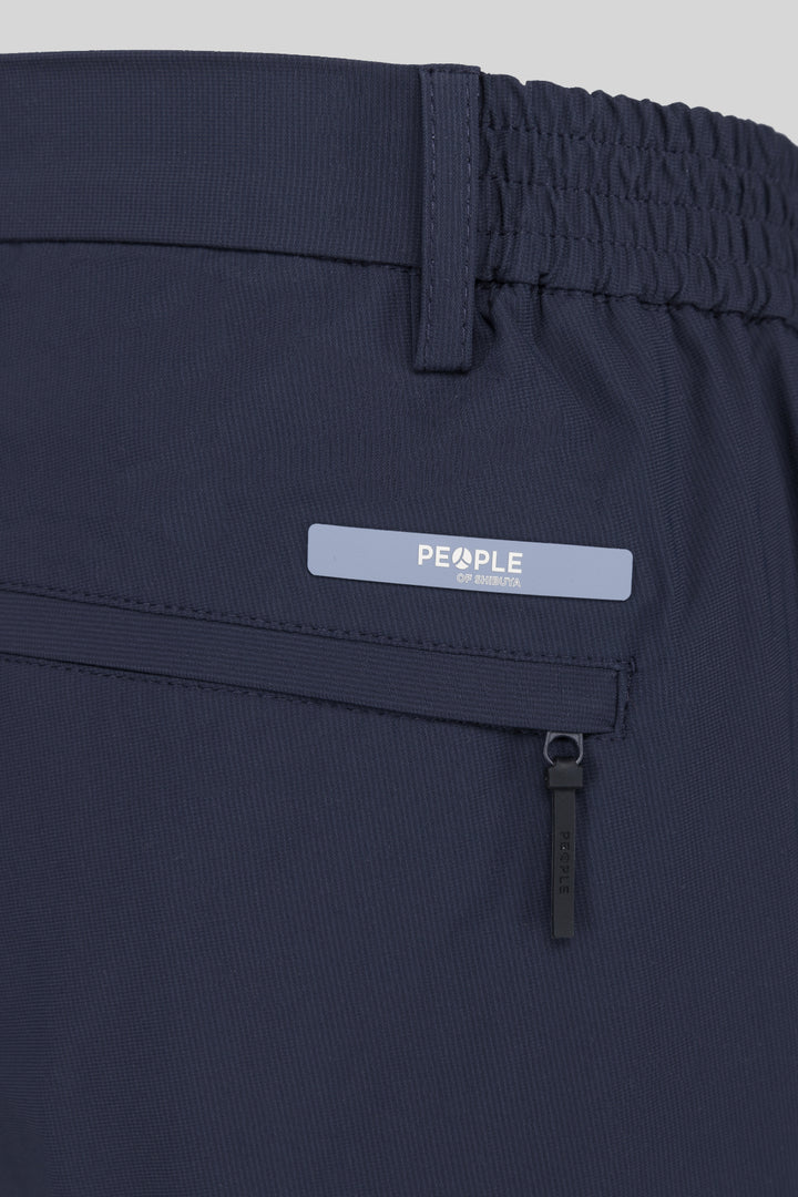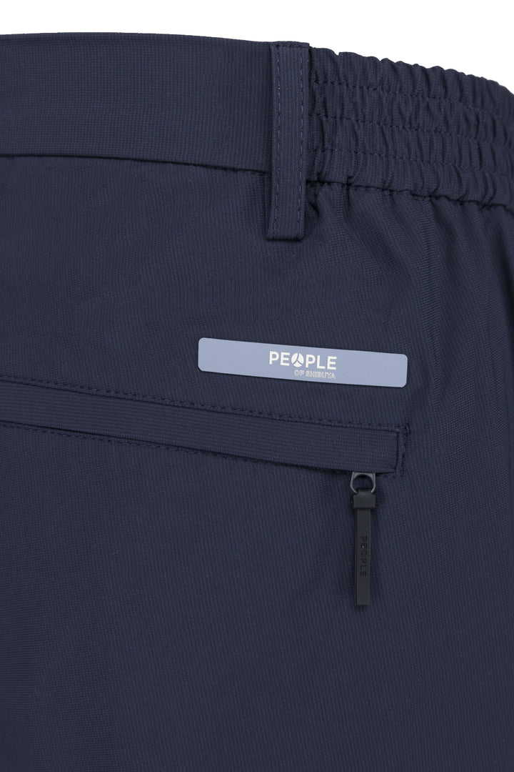- Cintura in vita con fianchi elasticizzati e passanti e bottone a gancio personalizzati.