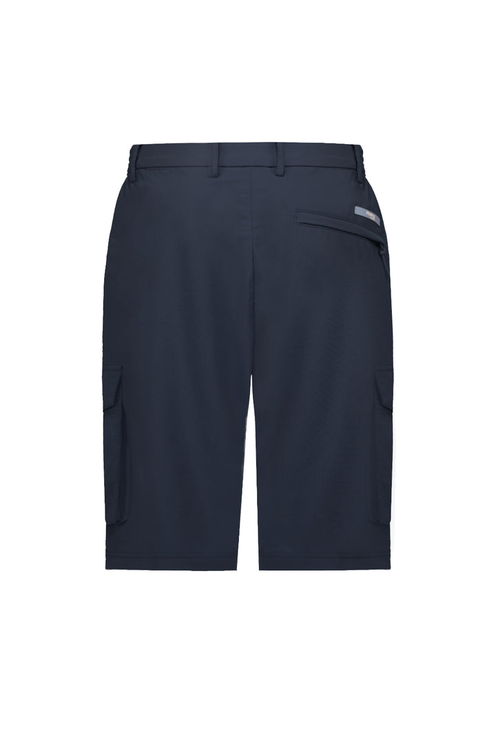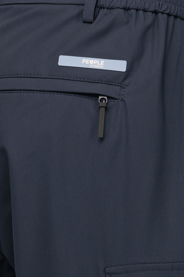 - Cintura in vita con fianchi elasticizzati e passanti e bottone a gancio personalizzato.