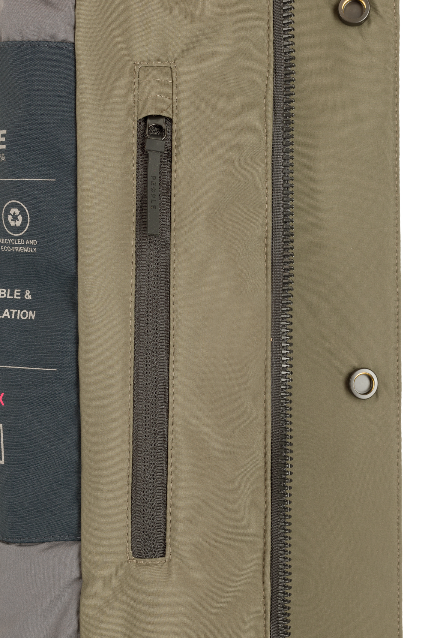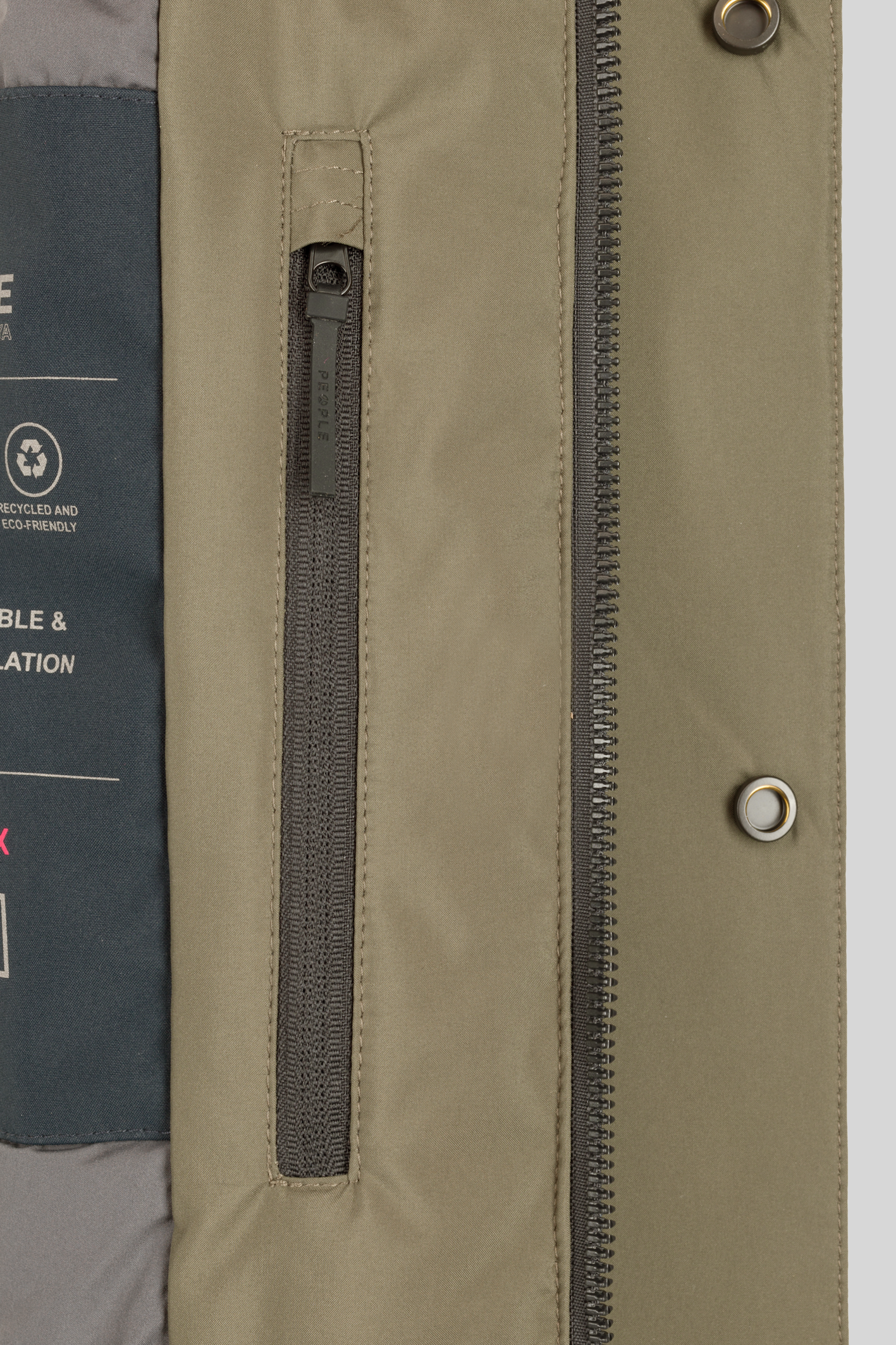 - Coprizip principale con chiusura bottoni a pressione nascosti.