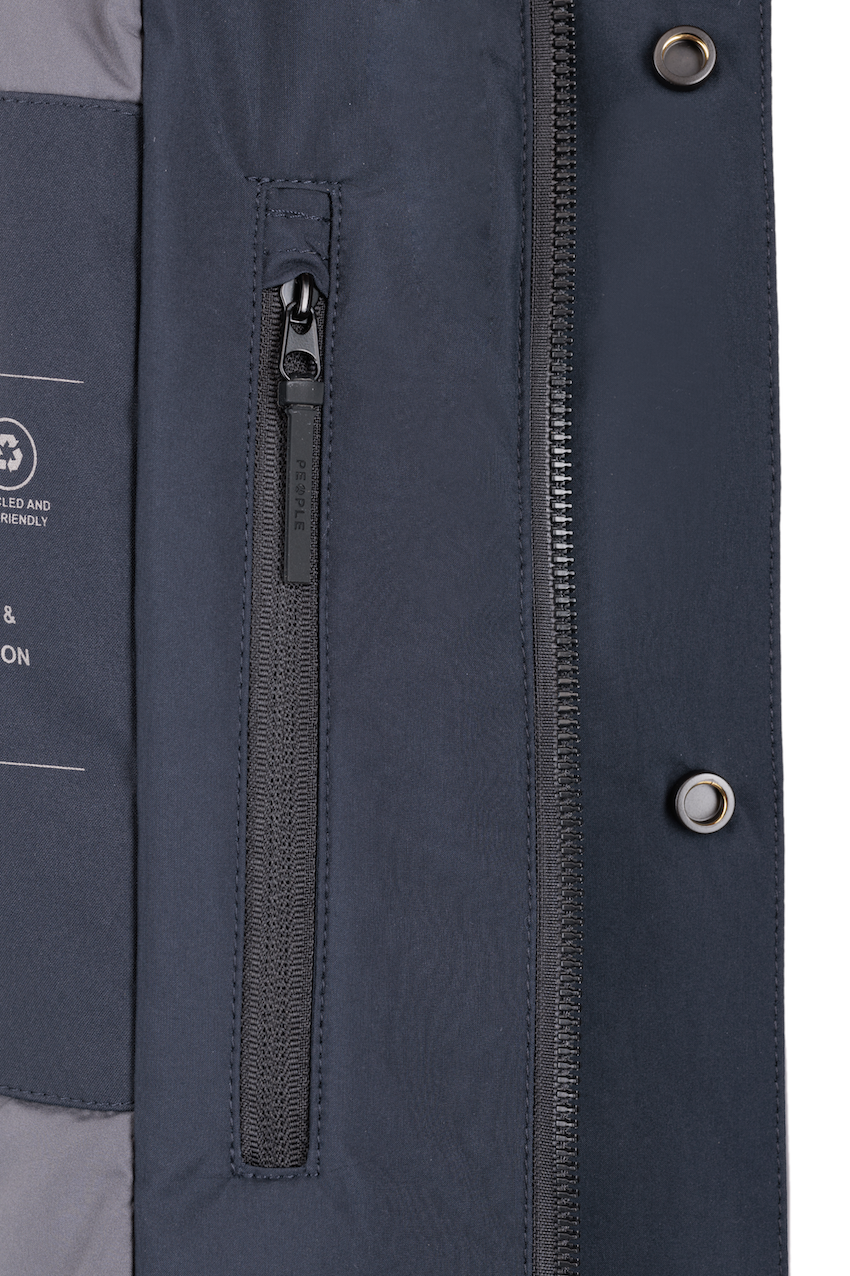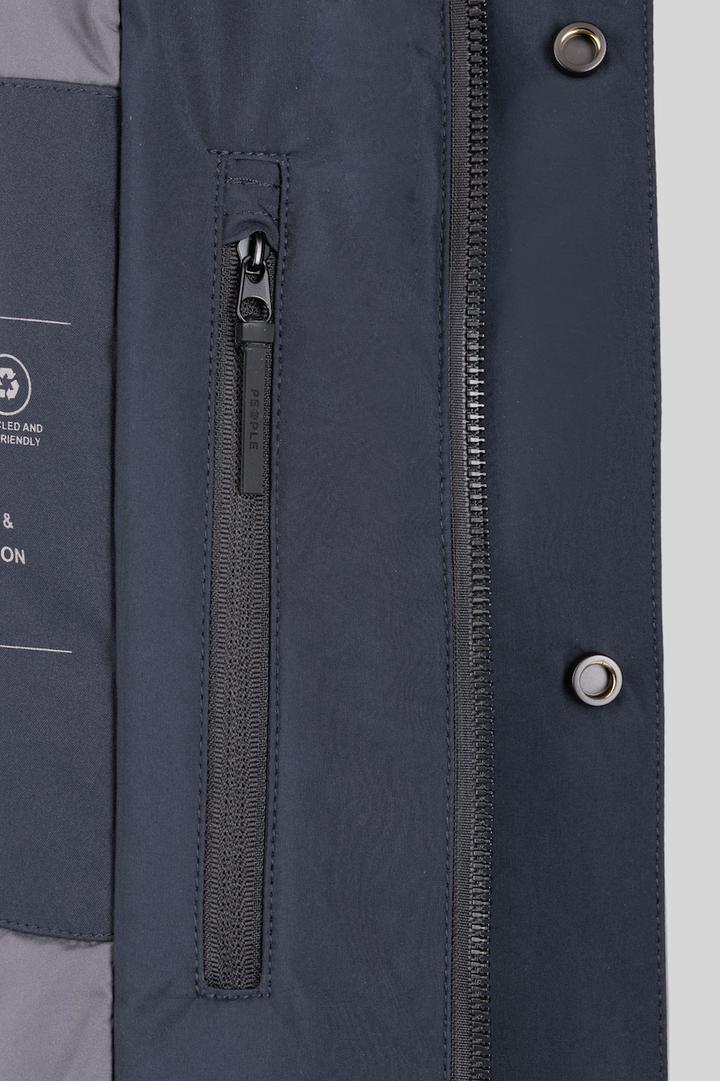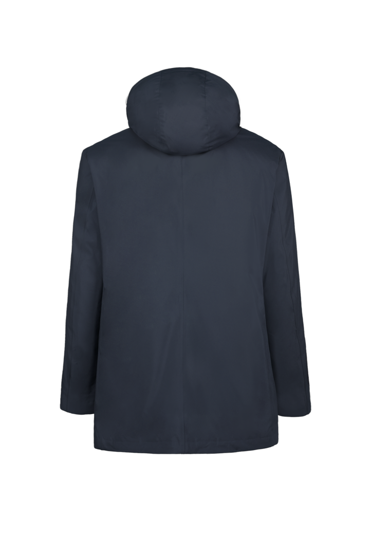 - Trench corto in tessuto tecnico con collo camicia e cappuccio staccabile con zip e coulisse, interno trapuntato in isolante termico “FELLEX” 100% riciclato.