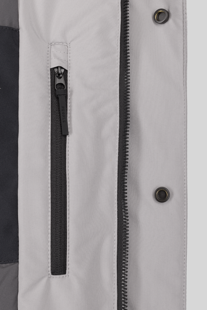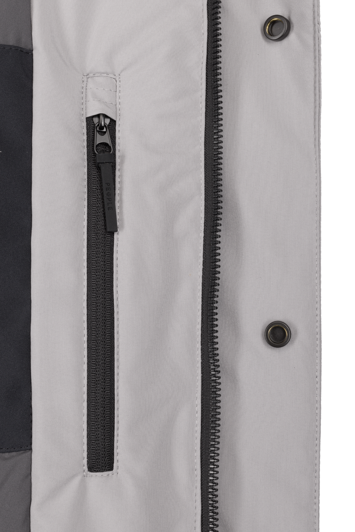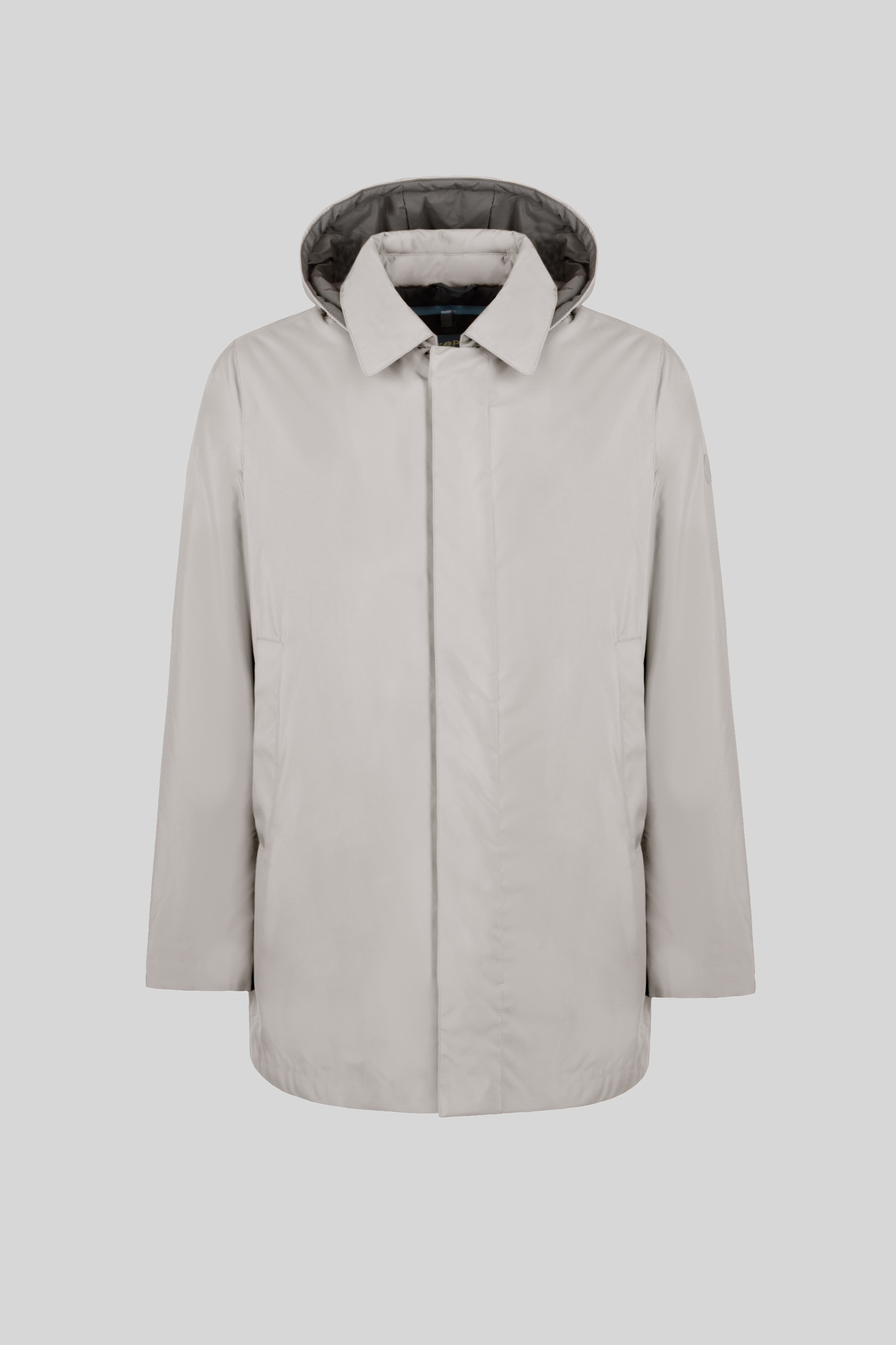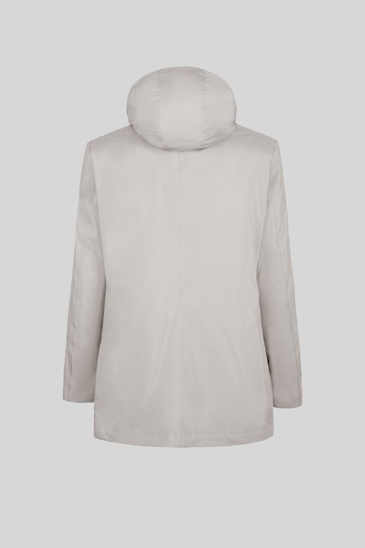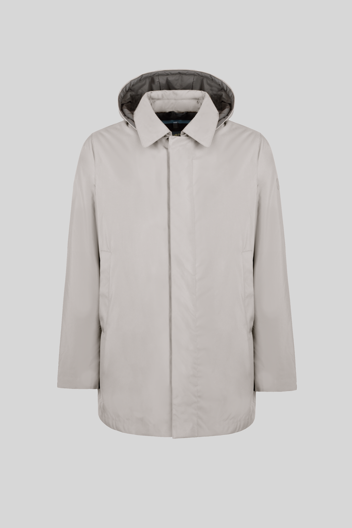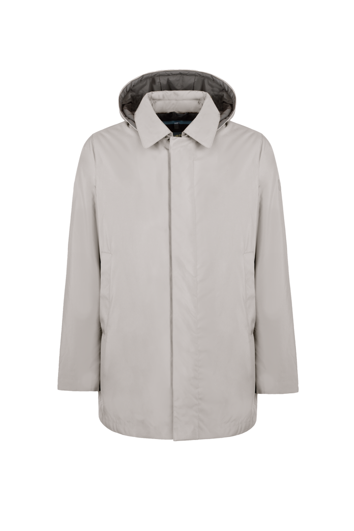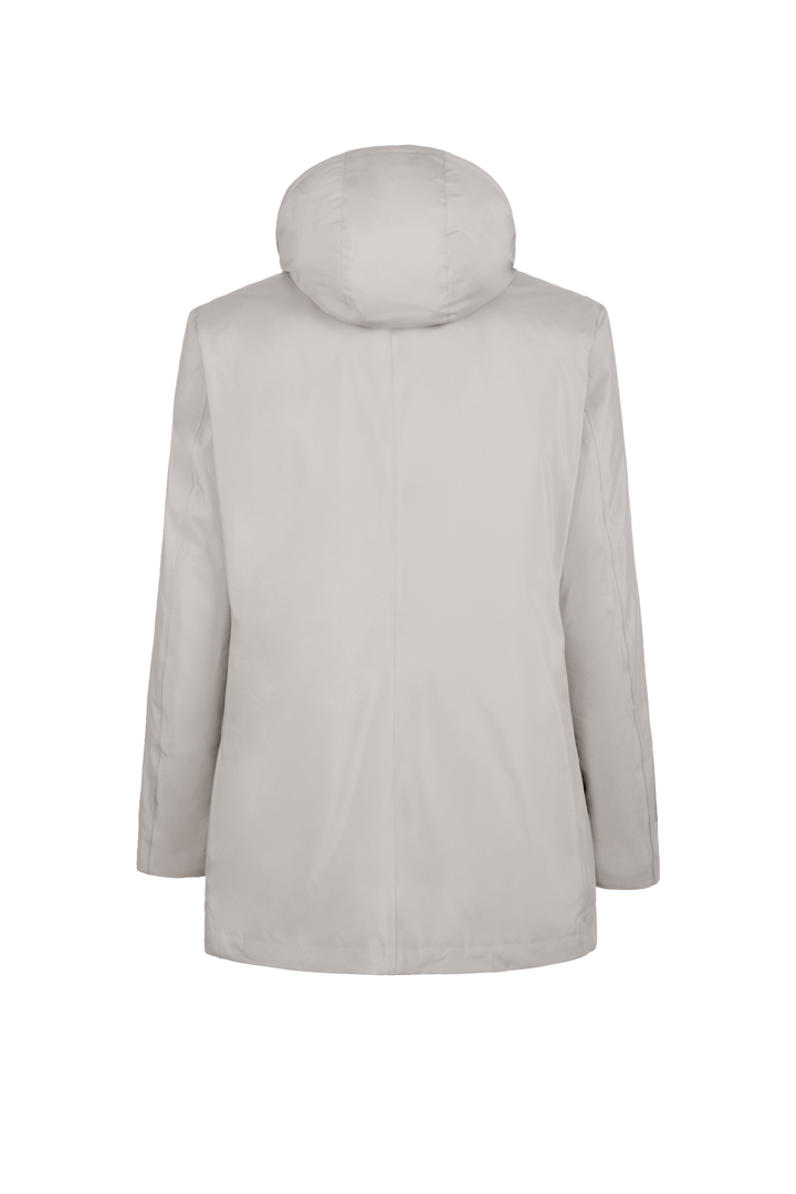 - Trench corto in tessuto tecnico con collo camicia e cappuccio staccabile con zip e coulisse, interno trapuntato in isolante termico “FELLEX” 100% riciclato.